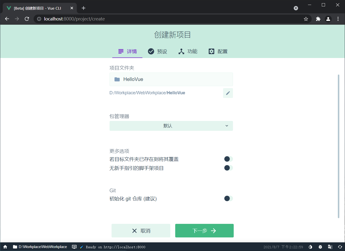 输入项目名并把Git选项关闭,点击下一步